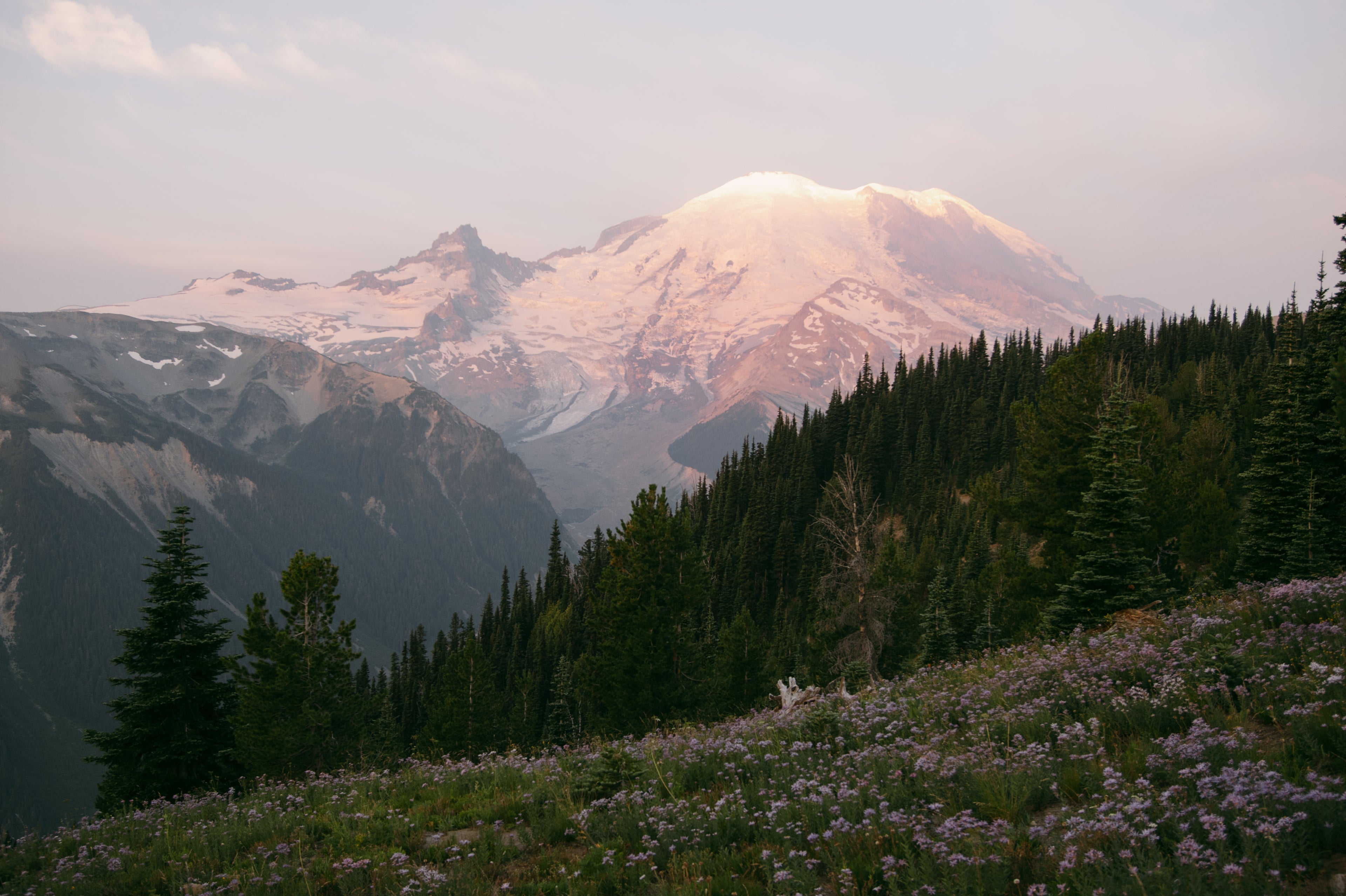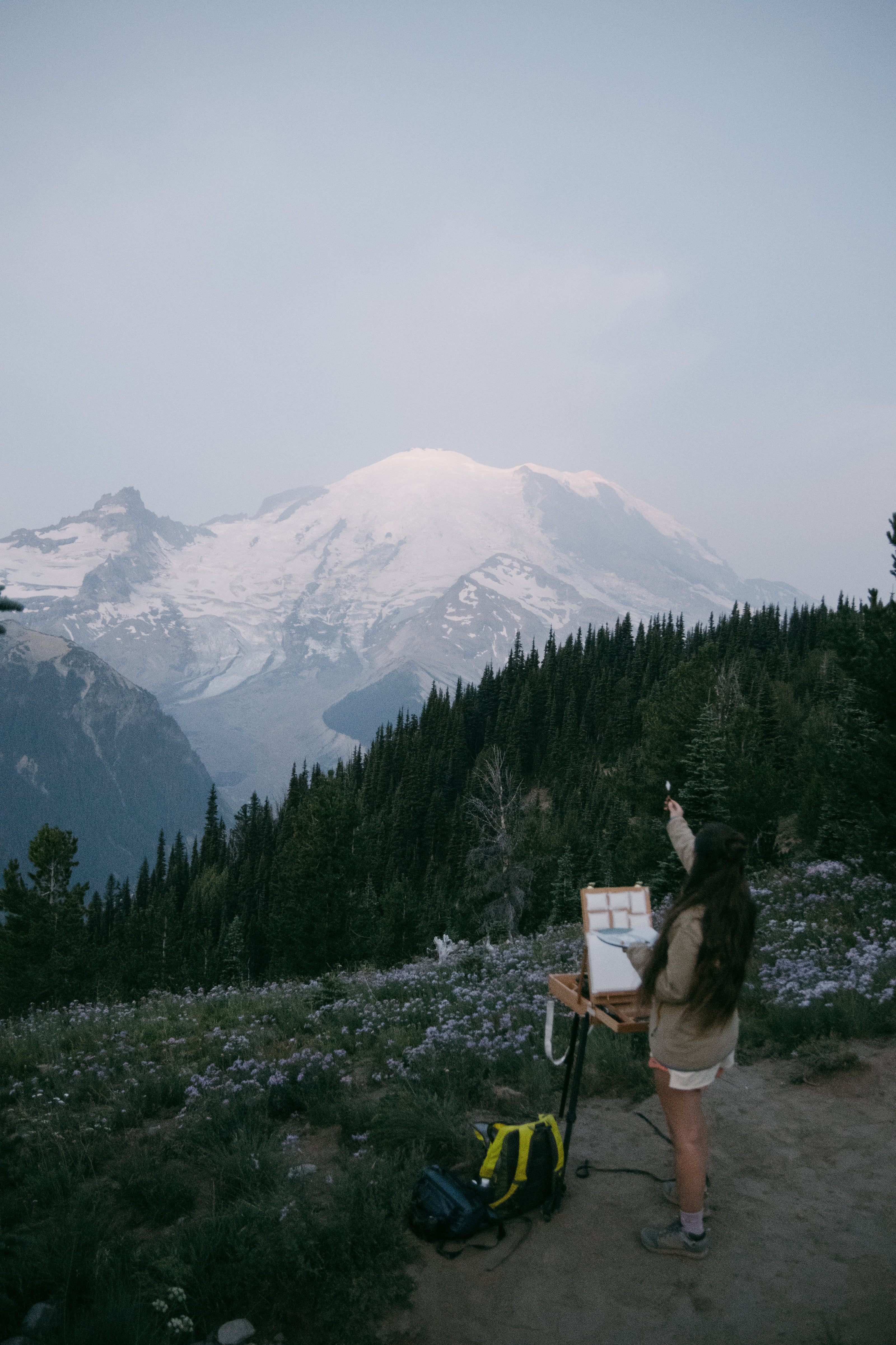 Some fragments of memories etch themselves deeper than others, perhaps because they shape us. Rainier National Park now lives only in memory, but it lingers like a vivid dream: the rush of water, the gentle sway of meadows, and every color imaginable scattered across the grass.The alarm was set for 4 a.m. I packed my art supplies and headed for the trail. Usually, when painting in national parks, I find a beautiful and easily accessible spot to set up but, I knew this morning would be different. I had a specific place in mind, one we had discovered a few days earlier. The morning was dark and cold, and I hadn’t dressed nearly well enough. Still, I walked about a mile through the dark silence to reach it.It was then I realized I was completely alone.We had come just in time for wildflower season, and I felt lucky as there’s not a joy like a flower can bring me. All about little towers of lavender, scarlet, blue, white, and yellow dotted the green meadows. While setting up, I often paused to admire these flowers shivering in the breeze, with blue butterflies hovering and landing on their blossoms. Just as my brush touched the paper, the sun stretched out its coral arms and unfolded Mount Rainier from its deep blue slumber. The glacier began to glow. The cliffs, immense and still, became a grand stage for the meadows and streams spread out below.There are moments in life too monumental to rush through. So I paused and sat down beside the fields of lupine and Indian paintbrush, which seemed to bow in reverence to the grandeur of the morning. And perhaps that’s what makes this memory stand out: not just the view, but the stillness, the solitude, and the sense of awe that rooted me in place.