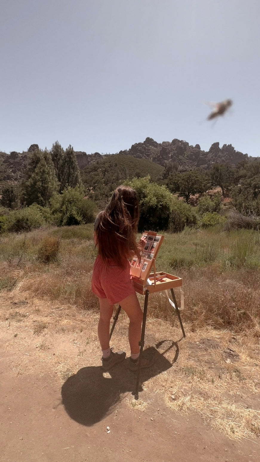 We sat there, on the top of the Pinnacles in Pinnacles National Park, scanning the heavens for something we once almost lost. And there it was, wings spread wide, with slight tilt of its head: the California Condor. It really was a site to behold, one I’ll hold onto forever. And there are many memories I’ll hold onto forever from Pinnacles: the drive in with lush green rolling hills, how dim light filtered into the caves, how the meadows looked housing wildflowers in bloom, how the woods put forth streams of light on my muddy boots, how many switchbacks there were climbing the Pinnacles, how many snakes we saw and almost stepped on, and painting facing the jagged rocks.This was on a Friday morning when I stood with a paintbrush in hand in front of the Pinnacles, letting nature simply be while capturing the essence of my surroundings; it invited me to listen. And how important it is to listen, nature is perpetual by design, but not indestructible. What a great reminder, the California Condor is, that each of us have the power to preserve what is for our children and our children’s children. It’s hard though, in a society of constant commotion and frenetic energy to do what nature demands of us. You see nature, while around us, does not come to you, you must go to it. Slow down, wait, and watch. Tell me, what is she telling you?