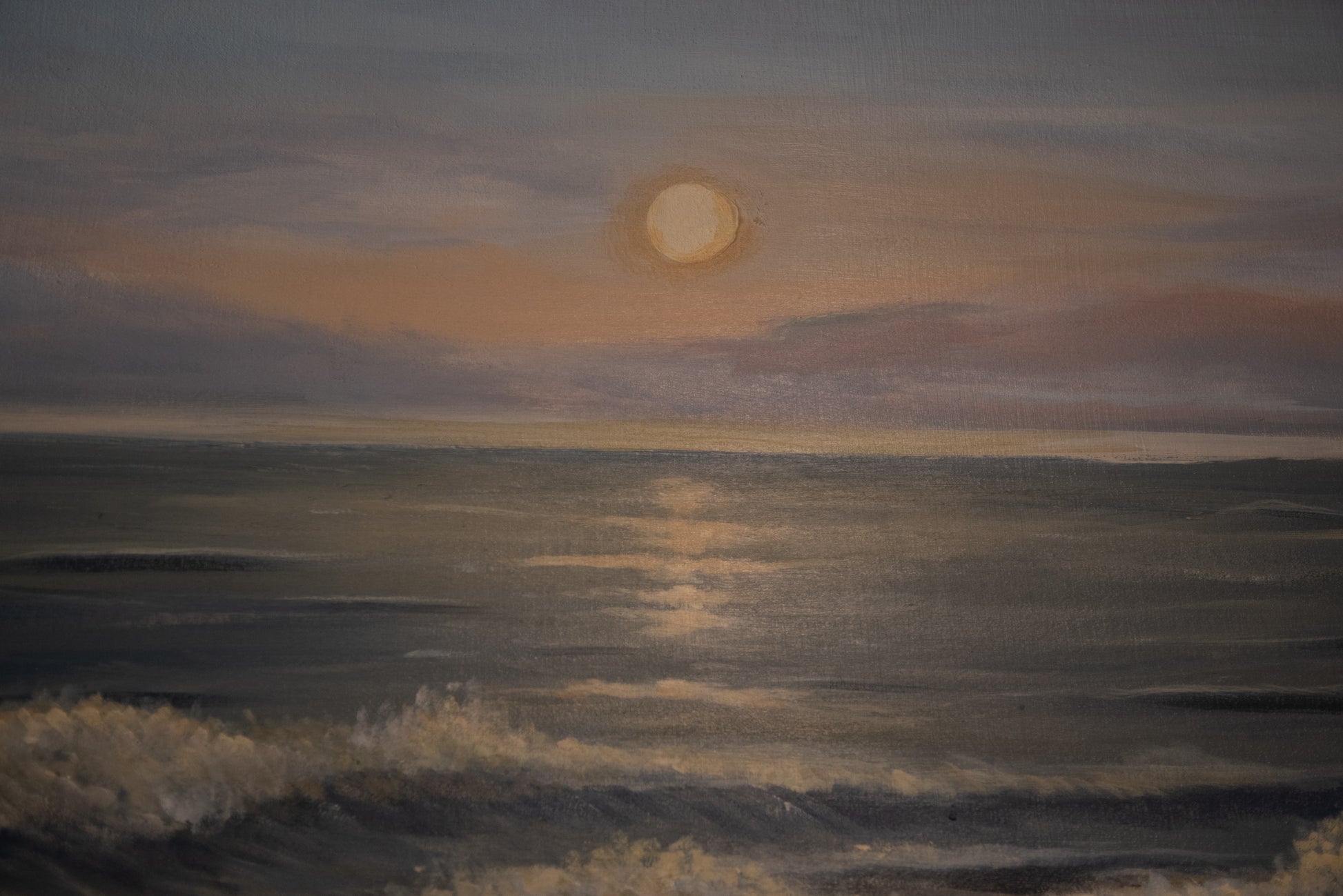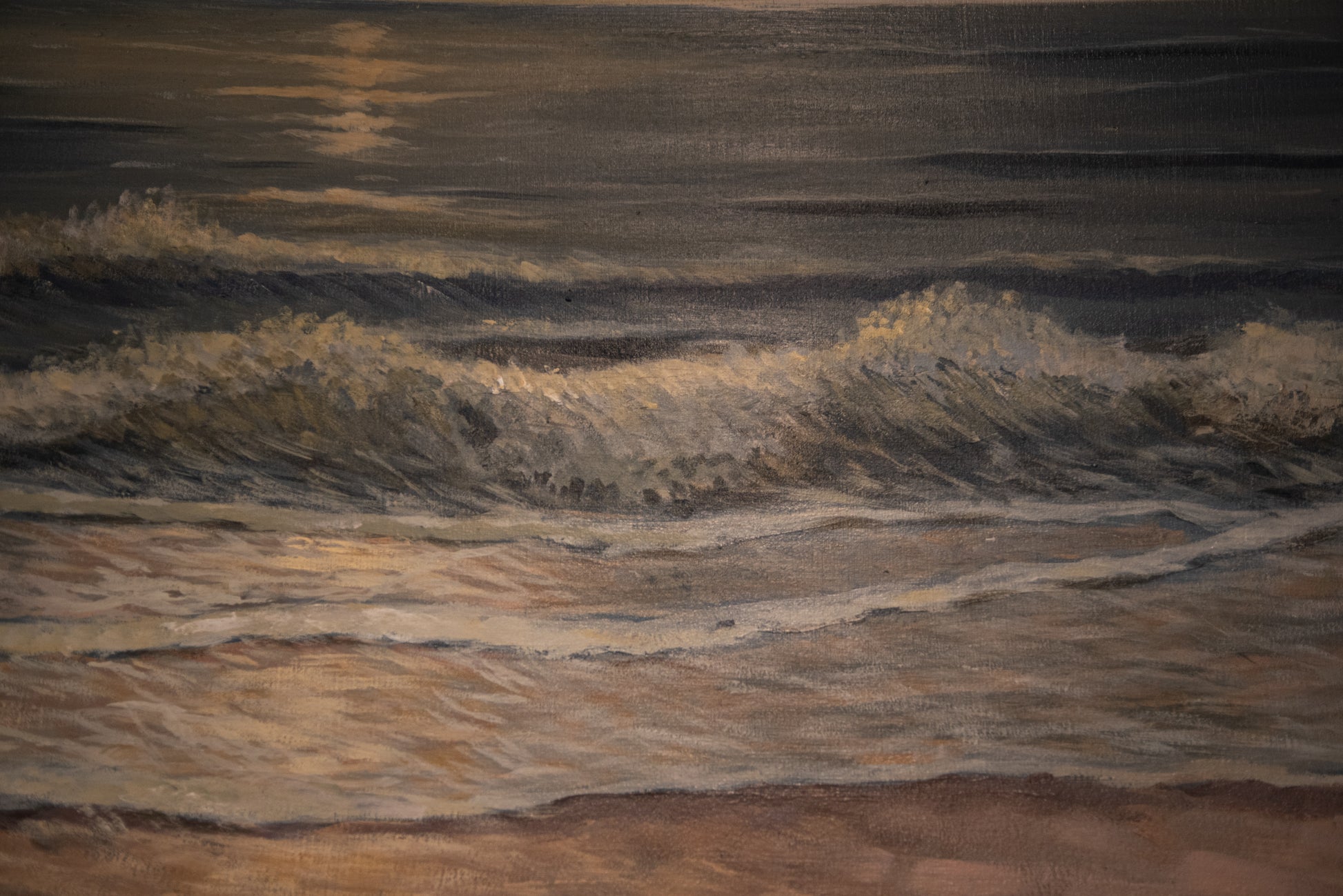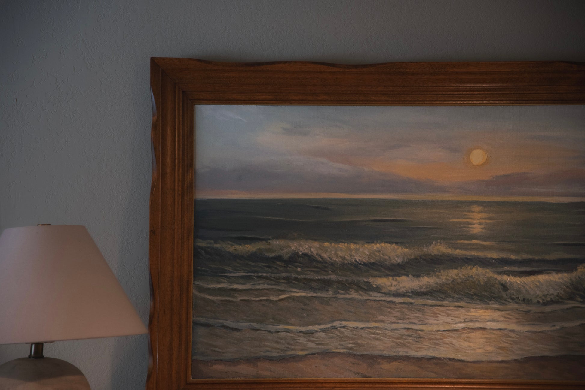 Original large ocean artwork, framed in vintage wood frame. Acrylic and gouache on wooden panel.