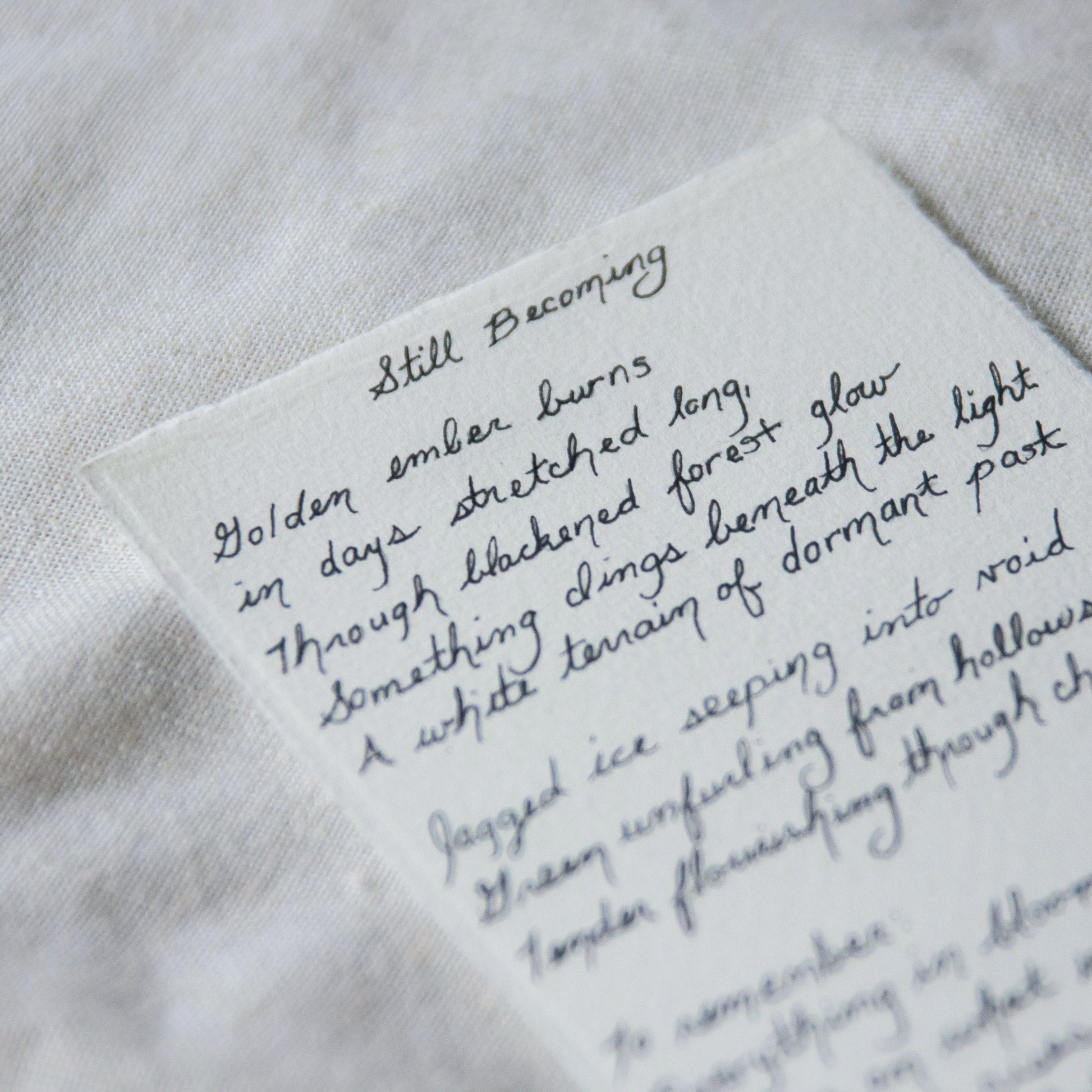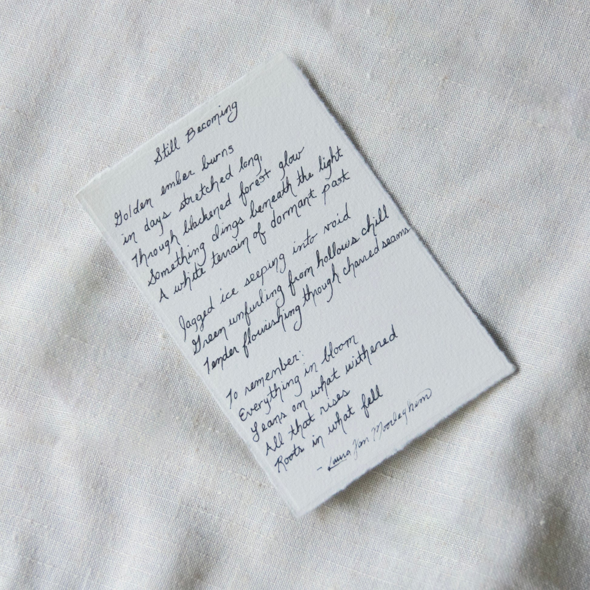 All originals will be sold with ‘Still Becoming’ poem, handwritten and signed, on 100% cotton rag, deckled edge paper.