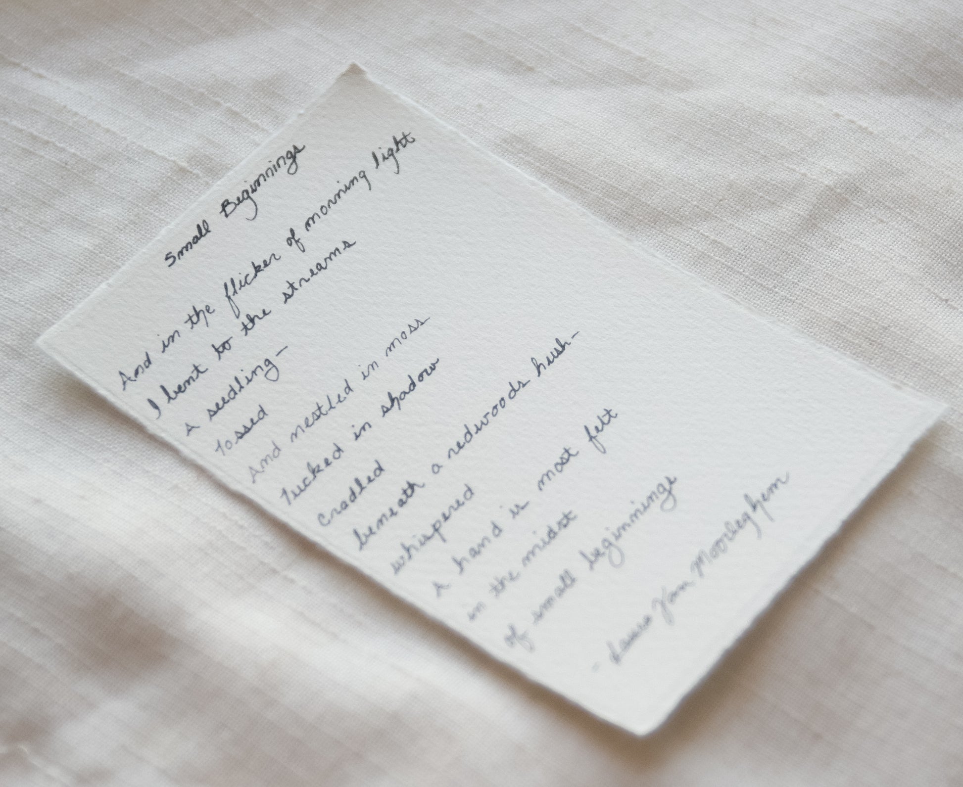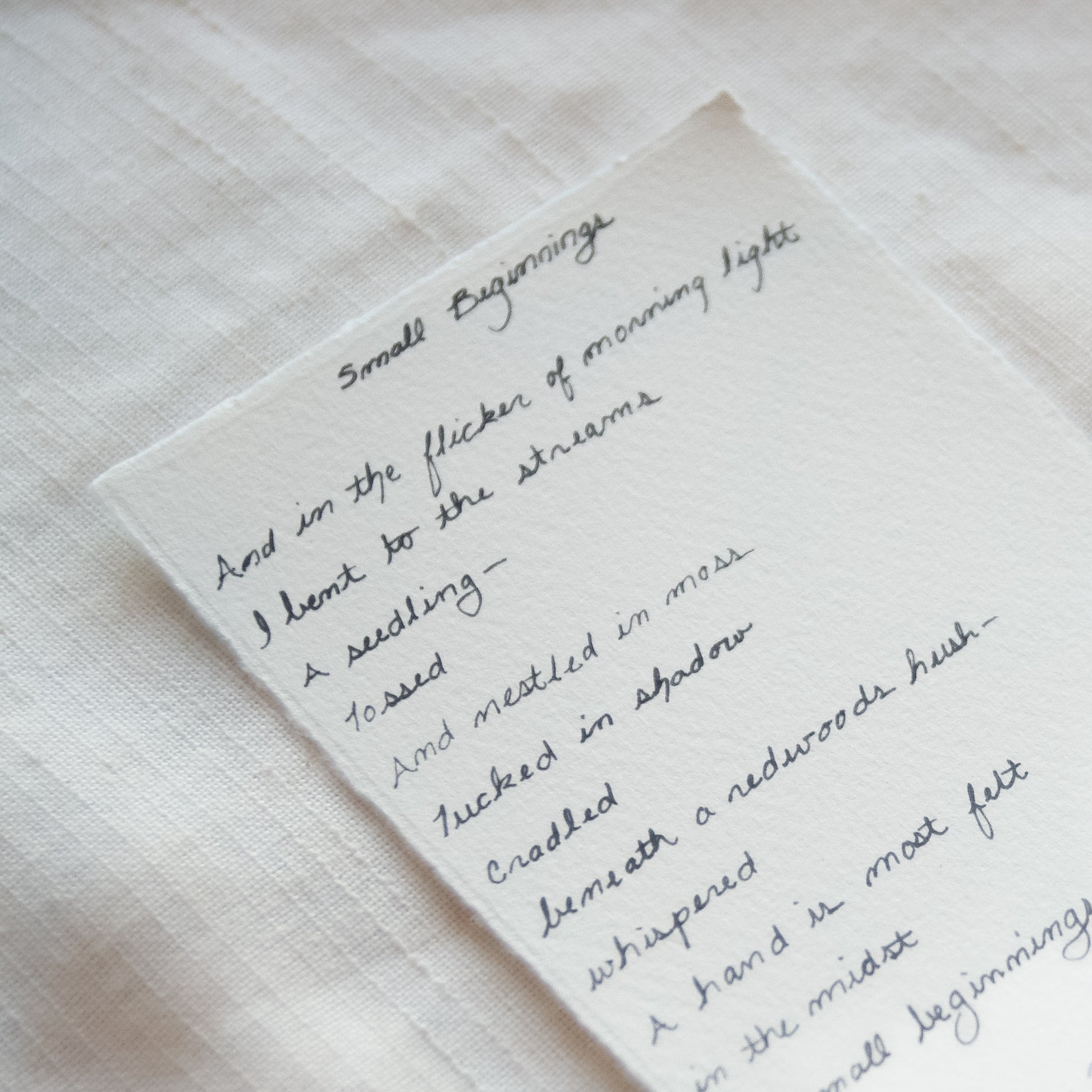 Handwritten poem: 3.3”x 5.2”, due to the nature of deckled edge paper, measurements may vary slightly.